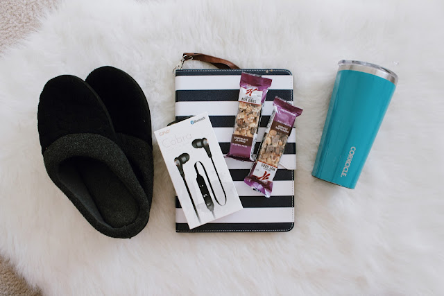 Bedroom slippers, headphones, ipad, snacks and my corkcicle to drink ALL of the water.